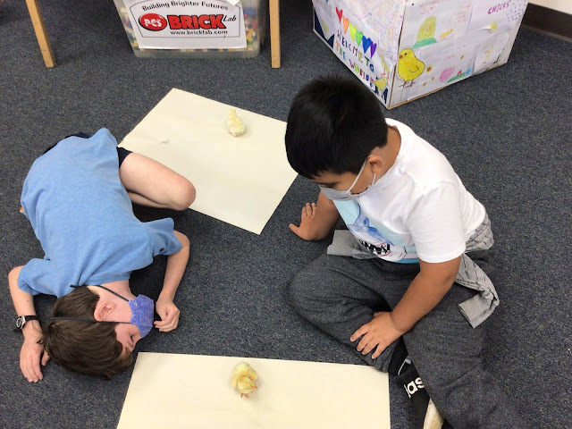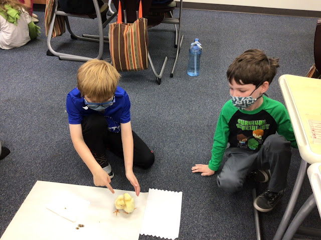 Of course, the big thing for science was the hatching of our chicks! The students were so excited we were able to have all 12 hatch. While we didn't get to see one hatching live (we are thinking they liked the classroom nice and quiet before they came out), I was able to catch one on video while students were at lunch. We spent time discussing the animal adaptations the chick needs to break out of the shell, what eggs parts were still visible, and what adaptations it needs to live outside of the shell. The best part of course was playing with them. : )